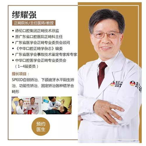 繆耀強院長從事口腔正畸臨床工作已有36年,曾在北大口腔醫院和悉尼大學牙學院進修深造,并多次赴美國、法國、臺灣、香港、日本等地參加國際正畸研討會。1993年始歷任廣東省口腔醫院正畸科副主任、主任。多次主持開展新技術新業務:例如自鎖托槽矯治在國內第一批臨床應用就是由他率先開展的。作為第一作者,在國內外專業雜志發表論文30余篇,且被全球口腔正畸學界著名雜志J.Clin.Orthod刊登,主編《SPEED矯治技術》。