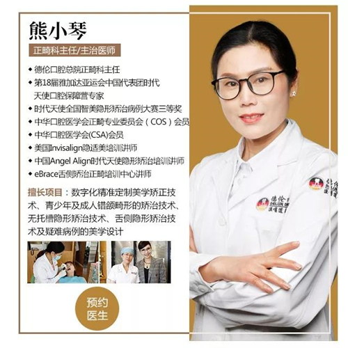 熊小琴主任畢業于廣州醫學院,從事口腔臨床工作22年,曾在公立三甲醫院學習工作多年。熊小琴主任經驗豐富、精于各類個性化高難度牙齒矯正,能高效,美觀,舒適地解決牙齒的矯正問題。作為國內早期熟練掌握隱形矯正技術專家,多次受邀參加口腔界的大型學術活動做學術報告,是華南地區隱形矯正推廣發起人之一,擔任2018雅加達亞運會中國代表團口腔保障專家,并在全國智美隱形矯治病例大賽榮獲三等獎,深受患者的信賴和好評。